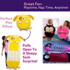 Vrolijke slaapzak voor kinderen: speelkussen slaapzak in een paar seconden verander je van een speels speelkussen in een draagbare speelslaapzak met geïntegreerd kussen. Ideaal om te overnachten met familie of hereniging met familie