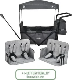 LEO X4 plus heeft 2 afneembare stoelen, elk met 2x 5-puntsgordels, waarmee u in slechts een paar eenvoudige stappen van een handkar een transportwagen kunt maken.